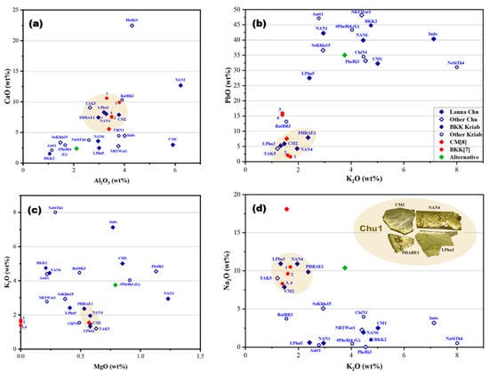 Interestingly, a significant cluster of Kriab and Chu samples aligns within the same group, specifically encompassing CaO concentrations of 5–12 wt% and Al2O3 concentrations of 2.5–4.2 wt%. This may suggest a shared silica source; however, further investigation of trace elements would be necessary to confirm this hypothesis. In contrast, the PbO-K2O relationship (Figure 7b) indicates some divergence among the samples, with only the main Chu Lanna and certain Kriab BKK[7] samples remaining in the group. These samples are characterized by low PbO levels, not exceeding 10 wt%.