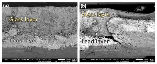 Figure 12 shows an example of the cross-section of the alternative Chu sample (1.6 wt% B2O3). The scissor-cutting technique was used for sample preparation without subsequent polishing. The interface appears smooth and straight, with some evidence of cracks at the interface, suggesting that the adhesion between the glass and lead layers is quite robust. Using in-house image analysis software integrated with the SEM (JSM-IT800), the thickness of the glass layer and lead layer was measured to be approximately 295.8 µm and 82.79 µm, respectively. This indicates that with a well-controlled coating technique, strong adhesion between the glass and lead layers can be achieved.