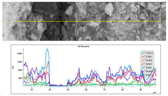 To preliminarily examine the chemical characteristics of the interface in the Chu mirror sample, an X-ray line scan was conducted, and the results are shown in Figure 11. Despite the use of high-resolution SEM, distinguishing the size of the interface layer proved challenging. The drop in the signal observed around 40–50 µm appears to be caused by a microcrack. Further analysis using XPS was performed on the same sample, as will be discussed in the next section.