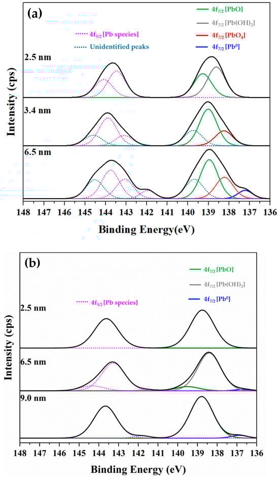 Representative XPS Pb 4f spectra obtained from the glass side of (a) ancient Chu and (b) alternative Chu mirror samples, showing the detected Pb 4f7/2 photoelectron species used to evaluate the chemical states of lead at the glass–lead interface.