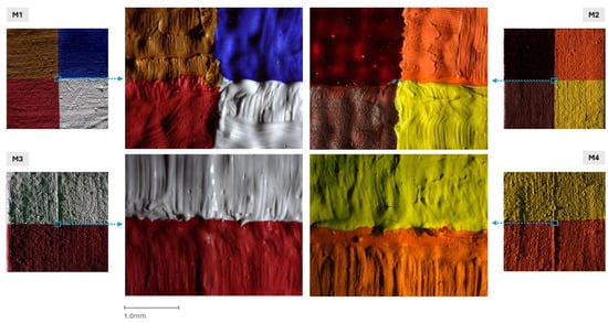 Finally, µRL has also been documented, given its importance in establishing the texture of the surface at a visual level. The AM4113ZT model was used in off mode for recording µRL images, using external LED lighting tangentially to the surface. The results obtained are particularly representative of establishing the texture of the materials used, the morphology and direction of the brushstrokes, and in some cases (as can be seen in M1 and M2) the texture of the support [17] (Figure 5).