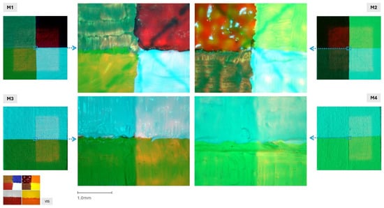 Regarding Type 1 mock-ups (M1 and M2), only in the area covered by titanium white in M1 was it possible to clearly visualise a diagonal line drawn in the underlying layer in the µTL image, which is less evident in the MBI image (Figure 6). The pigment that exhibited the highest light transmission in M2 was cadmium yellow, consistent with the µTL results and MBI; however, the underlying drawing remained invisible. In Type 2 mock-ups (M3 and M4), the underlying burnt Sienna became visible when the light emission was deactivated, and the titanium white layer in M3 permitted partial transmission. The microscopic image of M4 exhibited only minimal light transmission, a characteristic also observed in the corresponding MBI image. Overall, the results obtained from the microscopic images closely corresponded to those from MBI.