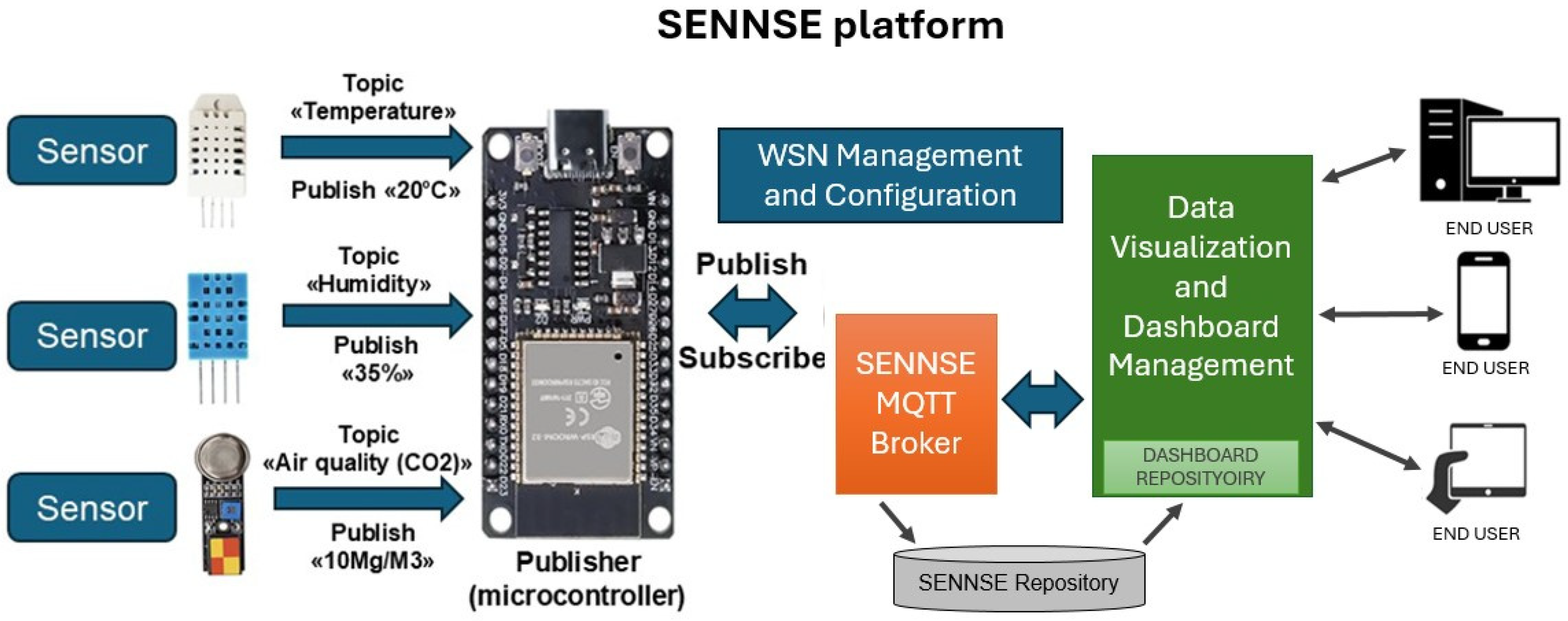 At the end of these two activities, the software layer of SENNSE was designed and developed to ensure efficient data acquisition and secure management. This layer integrates an MQTT broker that acts as the primary interface for collecting raw data streams from distributed WSN nodes, guaranteeing reliable ingestion even in large-scale deployments. To complement this, the SENNSE Repository was implemented. It employs a robust database for storing raw sensor readings along with configuration parameters, user profiles, and access control settings. To prevent data loss during peak loads or connectivity interruptions, the repository incorporates a queue-based buffering system, ensuring that incoming data is processed in a controlled manner before being routed to the visualization layer.