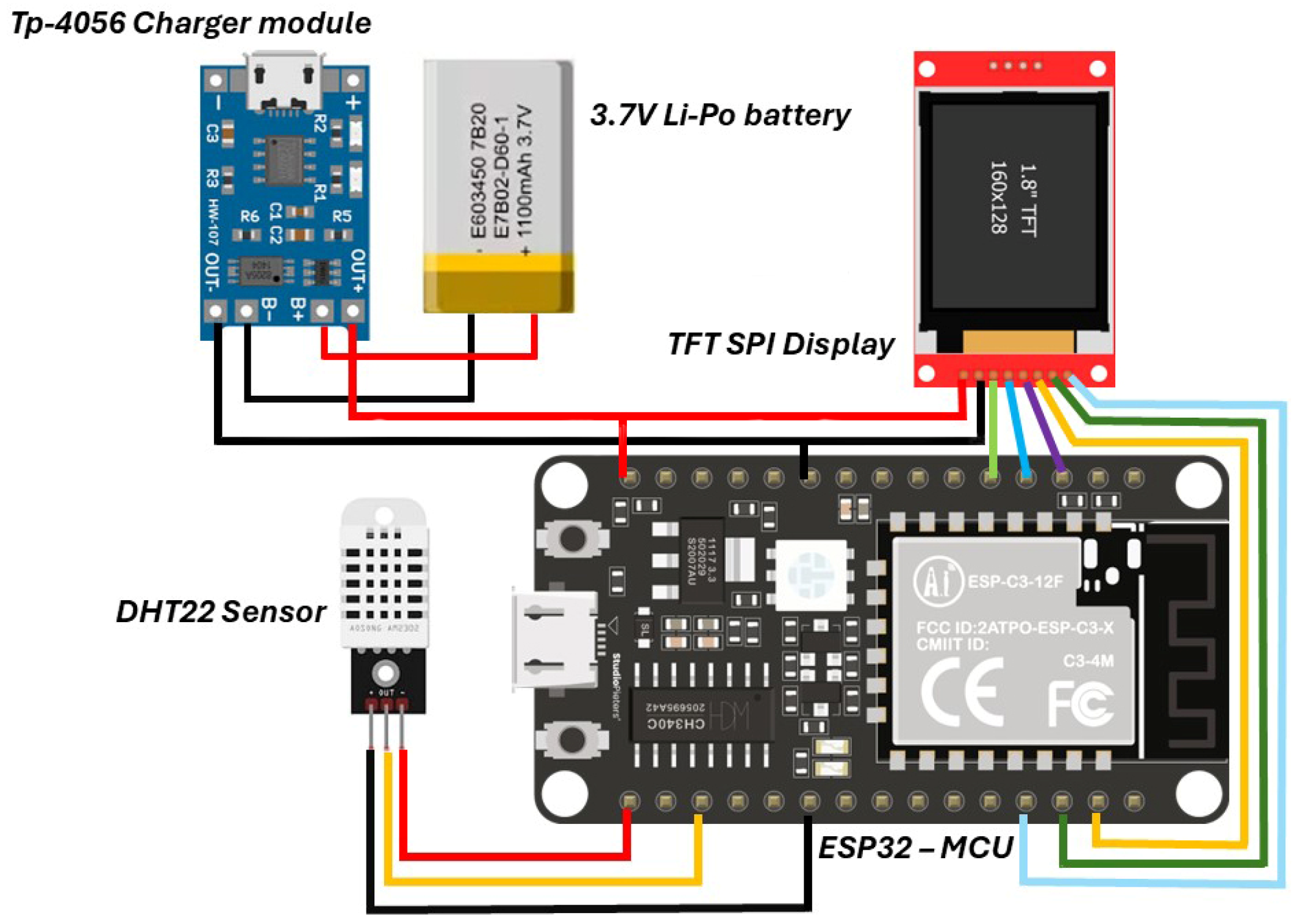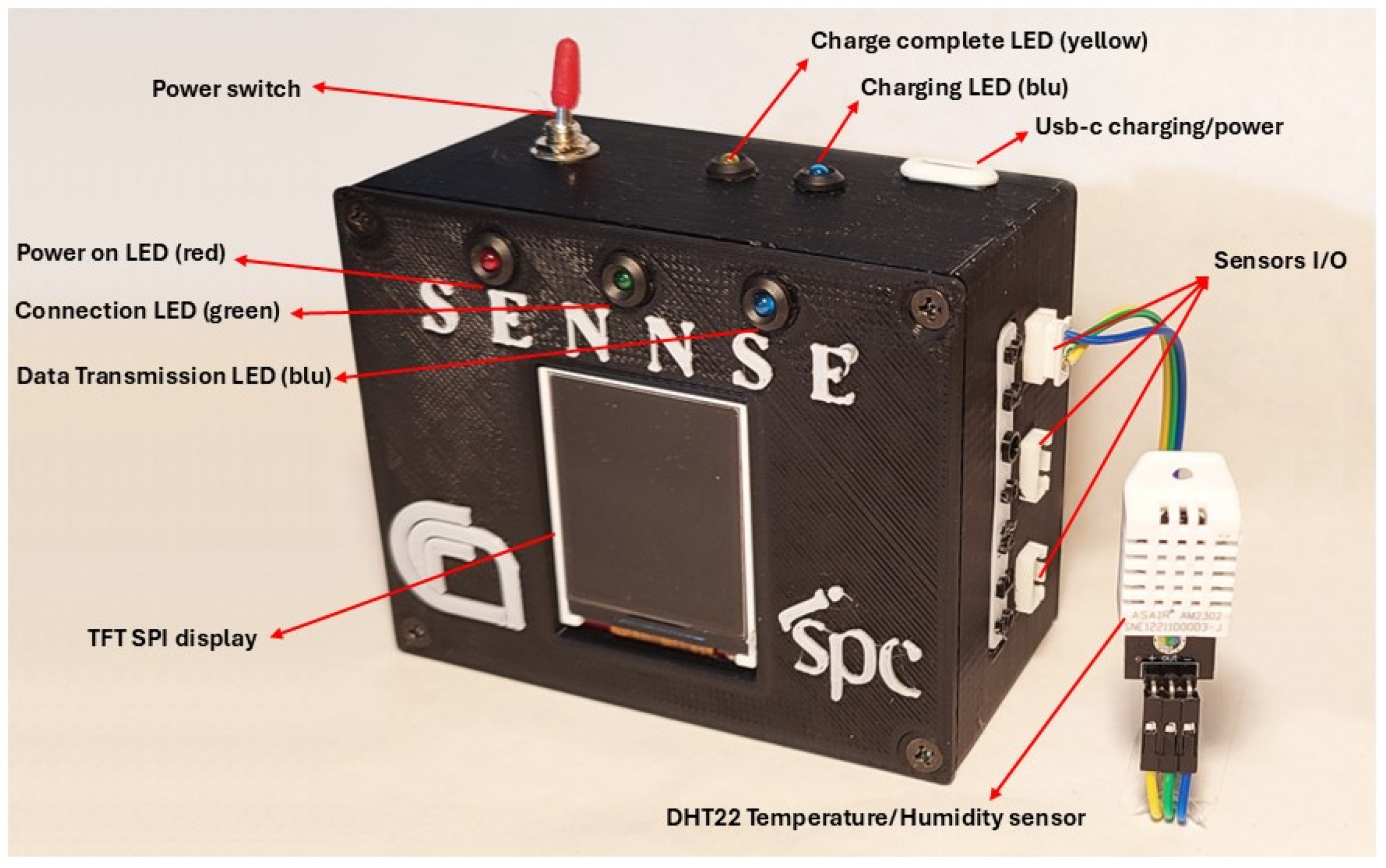 Figure 5. Final print with connectors, all the electronics and the DHT22 sensor.