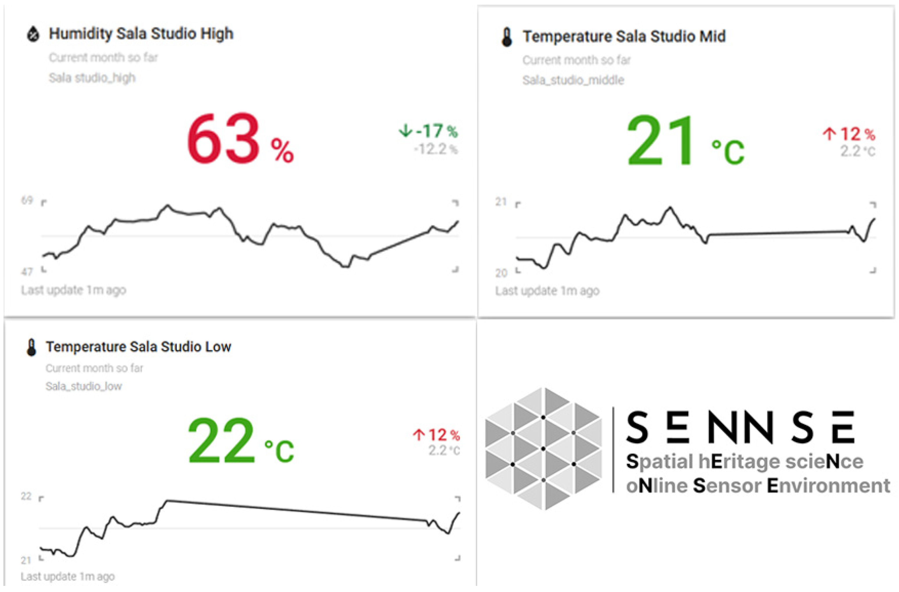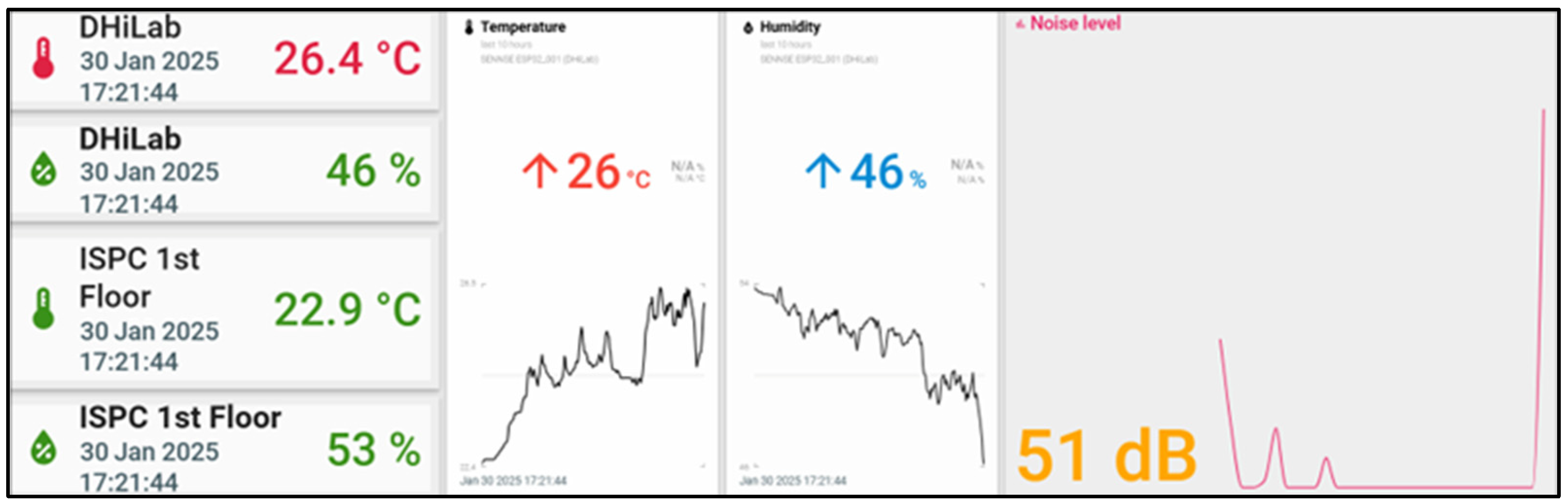 Figure 9. Screenshot of the dashboard showing data from sensor nodes installed in our labs. The dashboard provides a quick overview of environmental conditions across different areas of the building: the left side shows data on humidity and temperature from sensors in the DHiLab room and the corridor. The two graphs in the centre of the dashboard show the trends in humidity (blue arrow) and temperature (red arrow) at the DHiLab throughout the day. Finally, in the right part, the real-time illuminance and noise values in DHiLab are shown together with a graph of the noise level trend.
