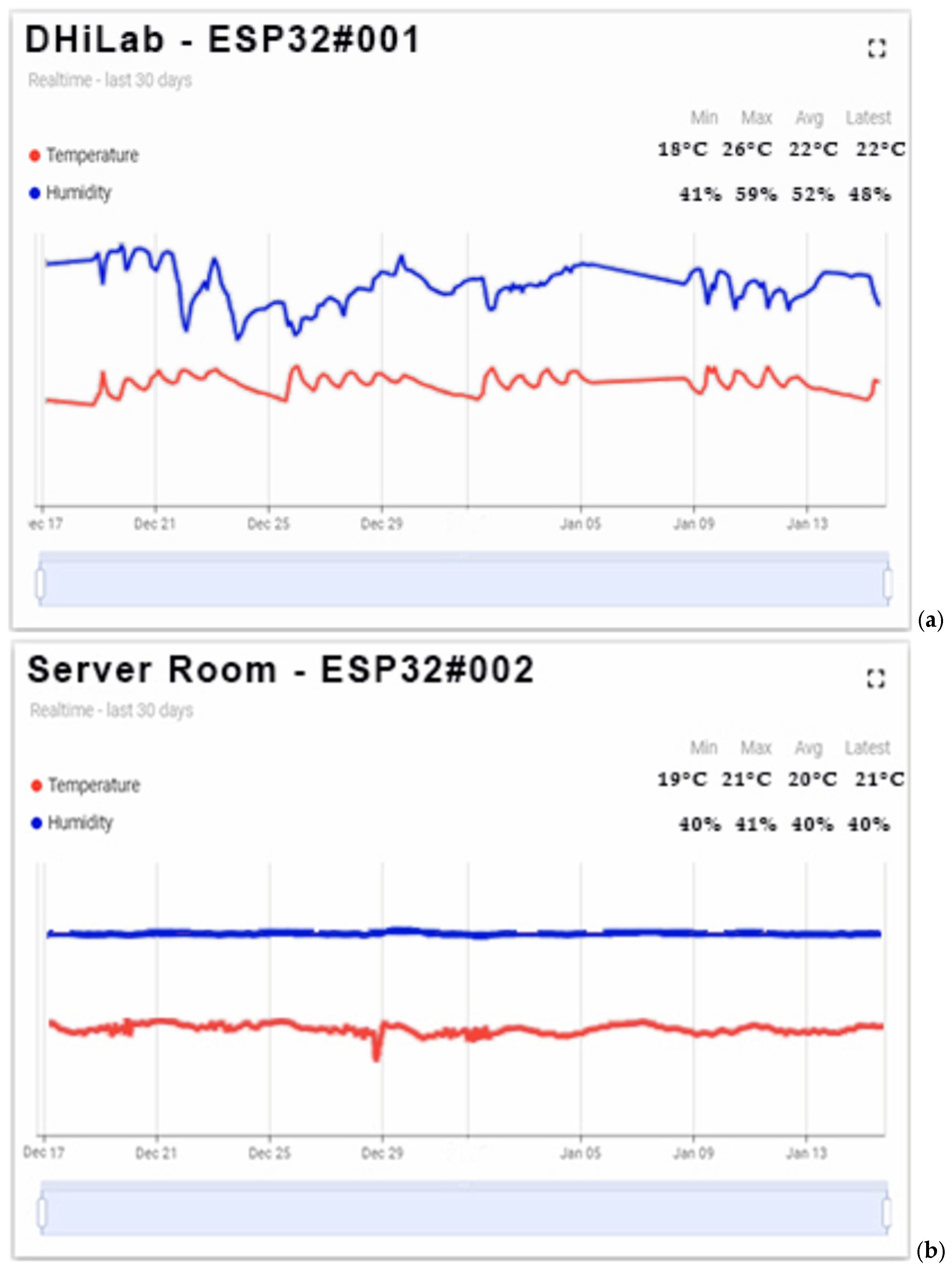 Figure 10. Humidity/temperature graphs comparing data acquired by sensors placed in two different rooms of the building: (a) data acquired in the DHiLab room; (b) data acquired in the server room.