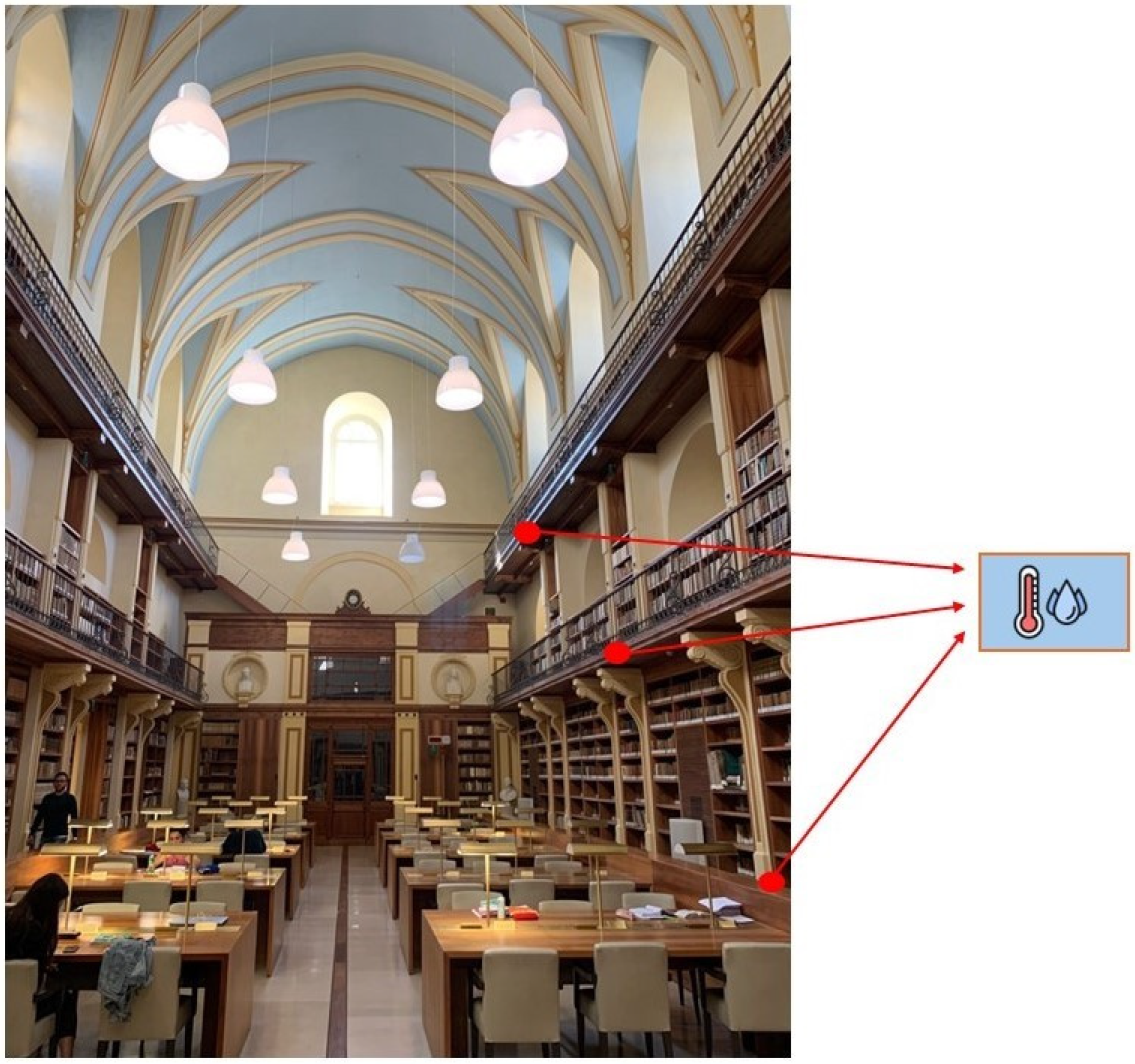 Figure 11. Bernardini Library in Lecce, Italy, highlighting the installation points for SENNSE nodes, with humidity and temperature sensors.