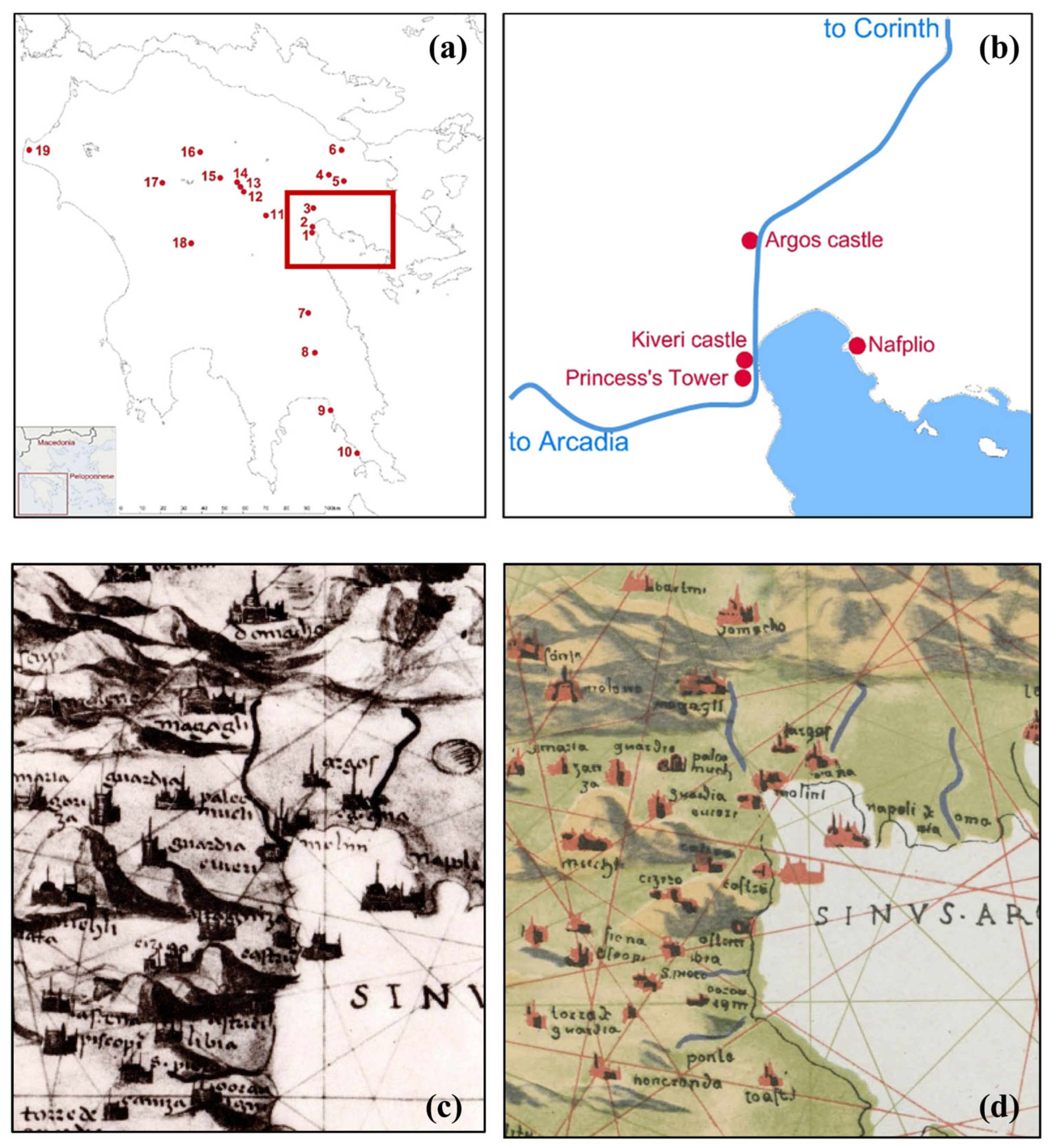 - Bon, A. La Morée Franque, Recherches Historiques, Topographiques et Archéologiques sur la Principauté d’ Achaïe (1205–1430); Album; Éditions E. de Boccard: Paris, France, 1969; pp. 8, 128–129. [Google Scholar]