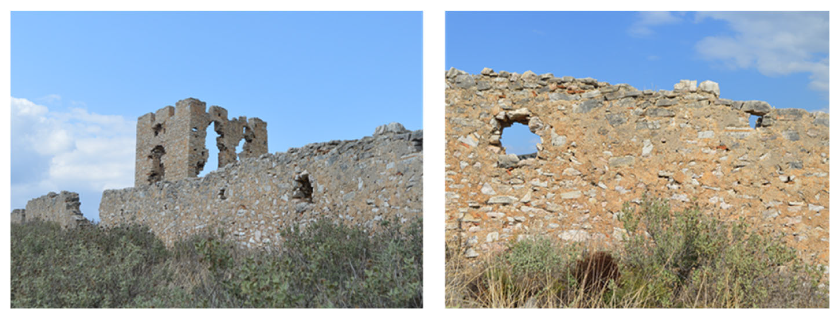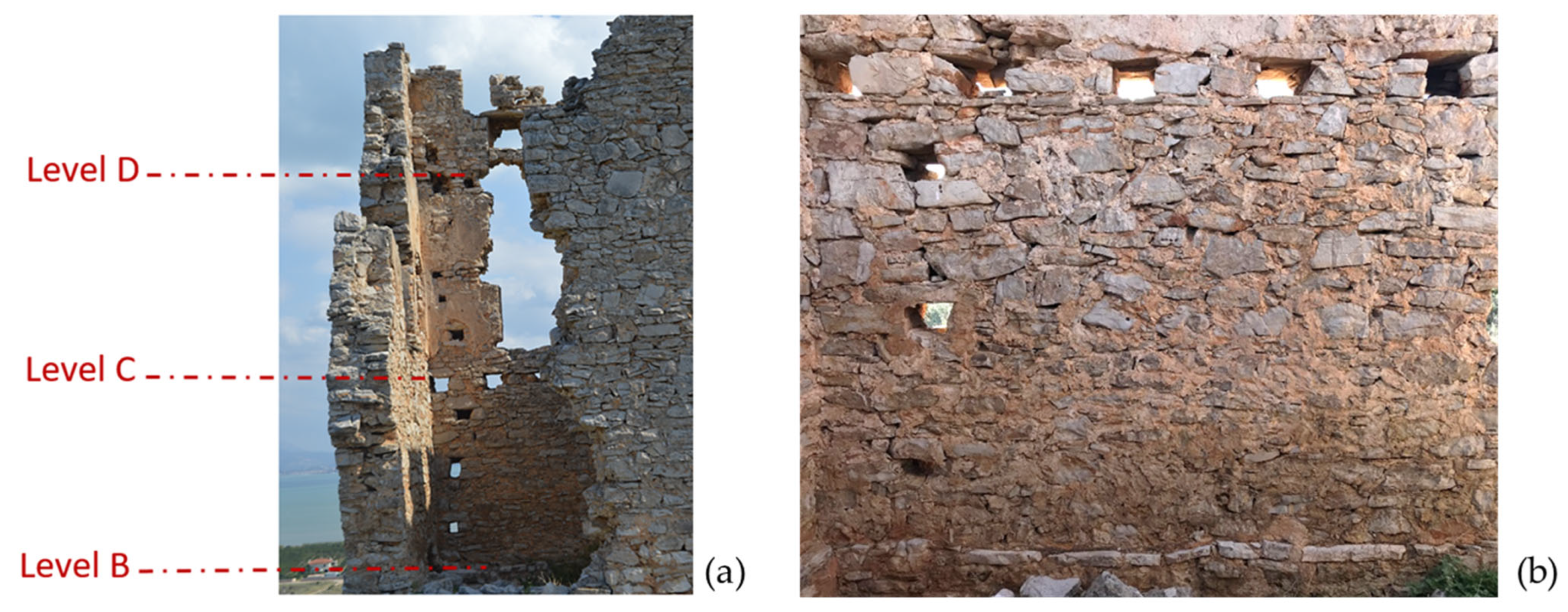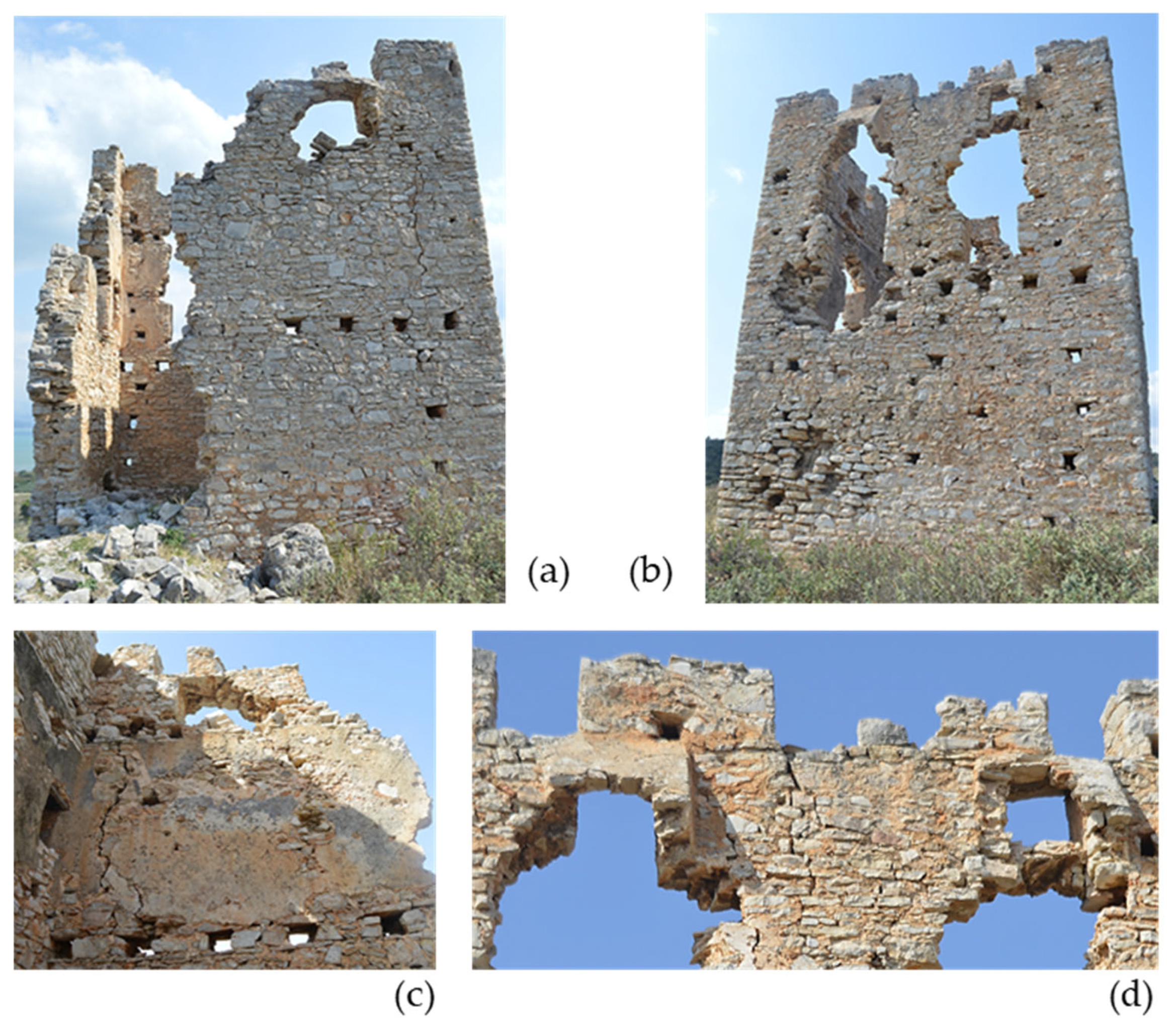 - Dimitroulias, K.; Koliatsi, P.; Alvanou, E. Architectural and historical documentation of the so-called “Castle of Monovyza” in Stavri, Gortynia. In Proceedings of the Third International Scientific Meeting, Archaeological Work in the Peloponnese (AWOP 3), Kalamata, Greece, 2–5 June 2021. (In Greek) [Google Scholar]