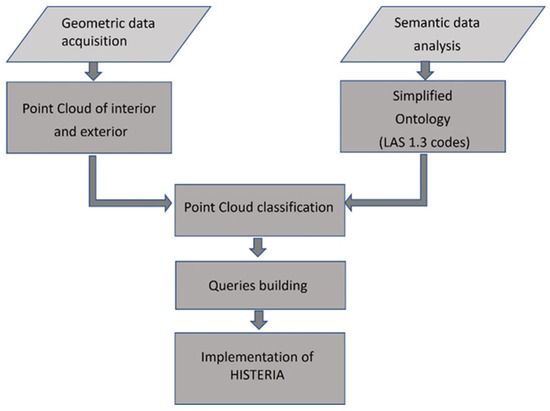 Figure 2 summarizes the workflow followed in this project. After the geometric data acquisition of the interior and exterior of the building, the respective point-clouds were registered (TLS) or created (photogrammetry). The available semantic data were analyzed, and an ontology was designed. The classification of the point-clouds followed, as well as the predefinition of queries. Finally, the app HISTERIA was implemented with a focus on the user. These steps are described in Section 2.1, Section 2.2, Section 2.3, Section 2.4 and Section 2.5.