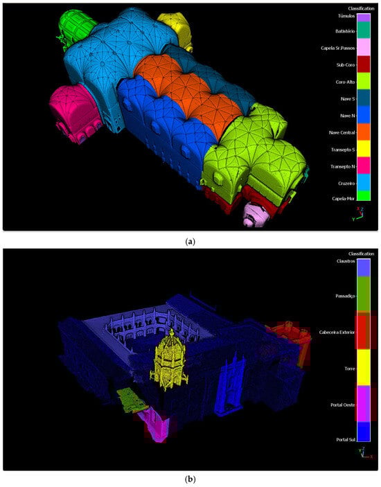 Point-cloud classified according to the Morphological Building Section Subtype: (a) interior; (b) exterior.