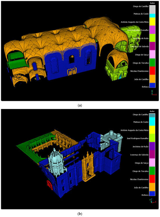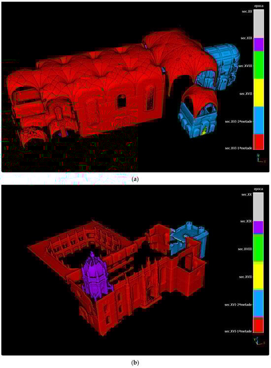 Figure 6, Figure 7, Figure 8 and Figure 9 show the coded classified point-clouds for each class. The interactive point-cloud classification was both the most time-consuming task and the most relevant. It required a constant interpretation of the text information in SIPA in order to suitably locate events in the cloud and classify them accordingly, sometimes resorting to other sources in the literature and to experts. This segmentation demands expertise from several fields according to each class of ontology (historians, art historians, architects), and in this phase, extra information not covered by SIPA can be included, such as information resulting from studies on the monument, including the seismic vulnerability indices of the vaults and columns. If it can be located, the information can be transferred to the point-cloud as values of a new class, enriching the 3D model and allowing more analyses across classes. Since the segmentation criteria are not of physical or geometric nature, like color, roughness or surface normal direction, for instance, an automatic classification was out of the question, and an interactive approach, as shown, was required.
