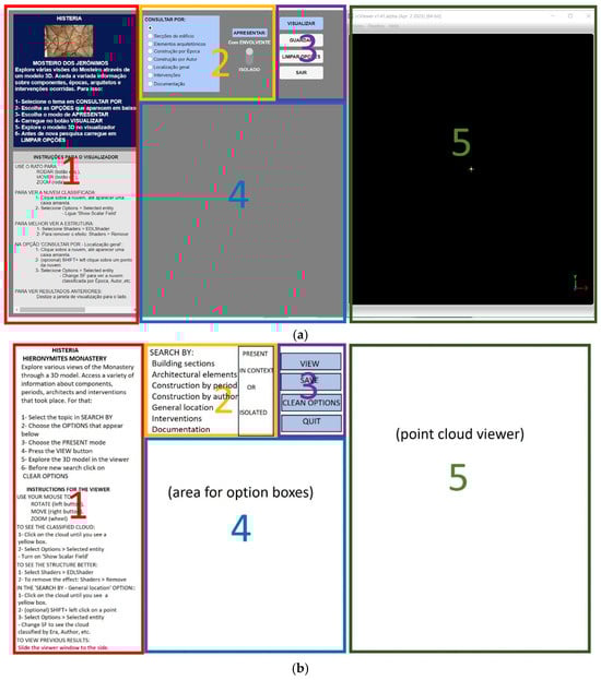 Continuing the description of the interface fields, field 3 (Figure 10) contains the action buttons. Four buttons, VIEW, SAVE, CLEAN OPTIONS and QUIT, respectively allow the results of the queries to be seen in the form of point-clouds in the point-cloud viewer, saving the resulting point-cloud, cleaning the options to choose others, and quitting the application. The point-cloud viewer used was the CCViewer v1.41 alpha [53], which opens in field 5 on the right side of the interface. Near the point-cloud, in the viewer window, a color scale indicates the meaning of each presented point color (Figure 12). This is helpful in the interpretation of the result, especially when more than one option in each class was selected by the user. The point-cloud can be interactively moved, rotated, and amplified, and it can also be observed with natural RGB colors instead of the classification color code.