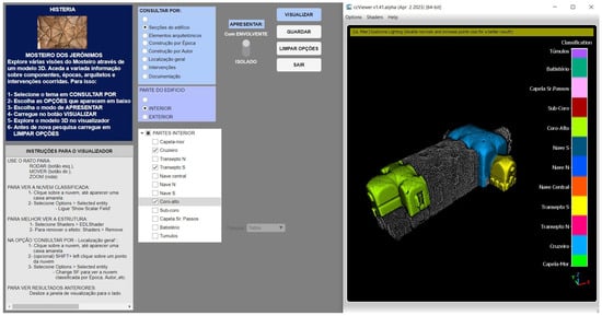 HISTERIA is an application that combines queries over semantic information with spatial representation of heritage buildings by means of point-clouds. The point-cloud data can be obtained with the usual geospatial surveying methods, such as photogrammetry or laser scanning, and must be classified according to an ontology that organizes semantic information in classes and lists of codes. The available semantic information in this project comes essentially from SIPA [41] and was completed using other sources in the case of vagueness. The ontology created was based on CIDOC-CRM, a standard conceptual reference model for cultural heritage and its extension CRMba. An additional class (H01 Intervention) was created as well as types and subtypes of standard classes. This way, the available information (chronology of events, list of architects, list of interventions) could be adequately described and related. Since it is based on a standard, the ontology can be easily improved with other classes for information that can be located in the heritage building, such as results of vulnerability studies (seismic, flood, etc.) that were not publicly available at the time the app was developed but exist [54,55,56,57]. The analysis of interventions in the building that occurred over time can be made using the application, allowing for areas never intervened to be verified and for others that were intervened with several times. Interventions were characterized not only by date but also by type and area intervened, which allows a more refined analysis. Non-locatable events in the chronology can be accessed via a hyperlink to SIPA or to the website of Museus e Monumentos de Portugal.