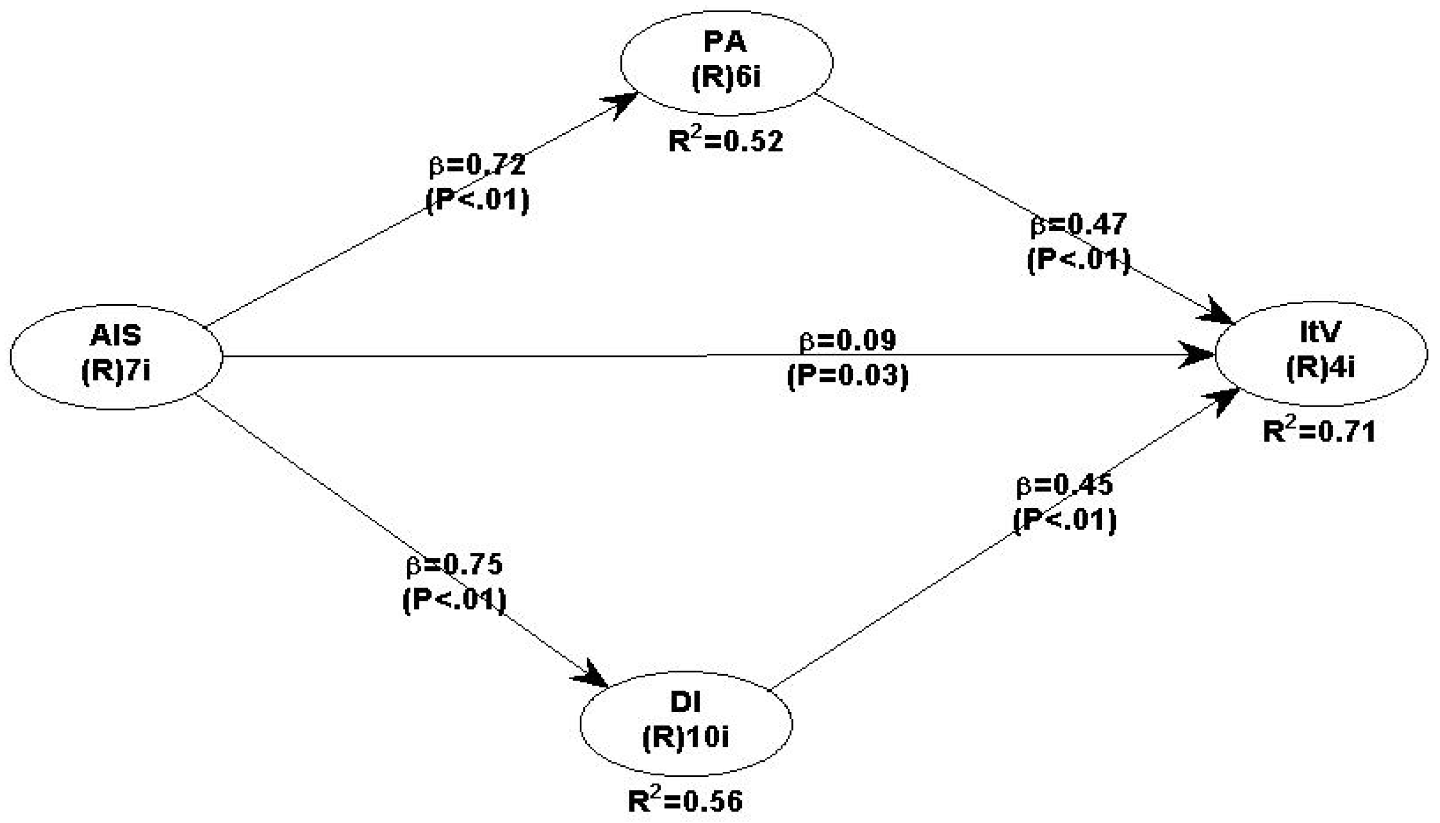 Finally, intention to visit is measured by four indicators, showing strong factor loadings between 0.668 and 0.921. The construct demonstrates good reliability, with a CR of 0.905 and a CA of 0.856. The AVE value of 0.706 indicates strong convergent validity, and the VIF value of 2.372 confirms that multicollinearity is not a concern for this construct.