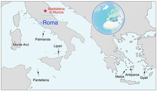 - Guidi, G.F.; Moioli, P.; Trojsi, G.; Anzidei, A.P.; Carboni, G. Corrélation par spectrométrie XRF des obsidiennes en provenance des sites archéologiques de Quadrato di Torre Spaccata et de la zone de Maccarese (Roma) avec les obsidiennes du bassin de la Méditerranée. In Actes du XIVème Congres UISPP (Liège, 2–8 Septembre 2001); BAR IntS 1270: Oxford, UK, 2004; pp. 71–74. [Google Scholar]