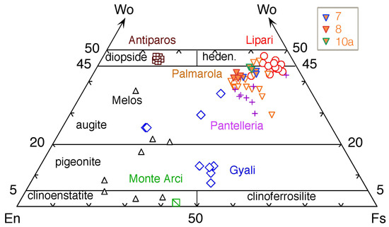 Compositions of pyroxenes according to the [40] nomenclature for the major obsidian source areas in the Mediterranean (data from [11,39]); pyroxenes from samples 7, 8 and 10a of the Maddalena di Muccia site are plotted as solid symbols. En: enstatite; Fs: ferrosilite; Wo: wollastonite; Aug: augite.