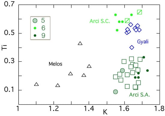 Composition of biotites plotted on a K vs. Ti diagram for the major Mediterranean obsidian source areas (data from [11]); biotite from samples 5, 6 and 9 of the Maddalena di Muccia site are plotted as solid symbols. Sub-source outcrops: Monte Arci, S.C. = Perdas Urias; S.A. = Conca Cannas, Canale Perdera and Riu Solacera.