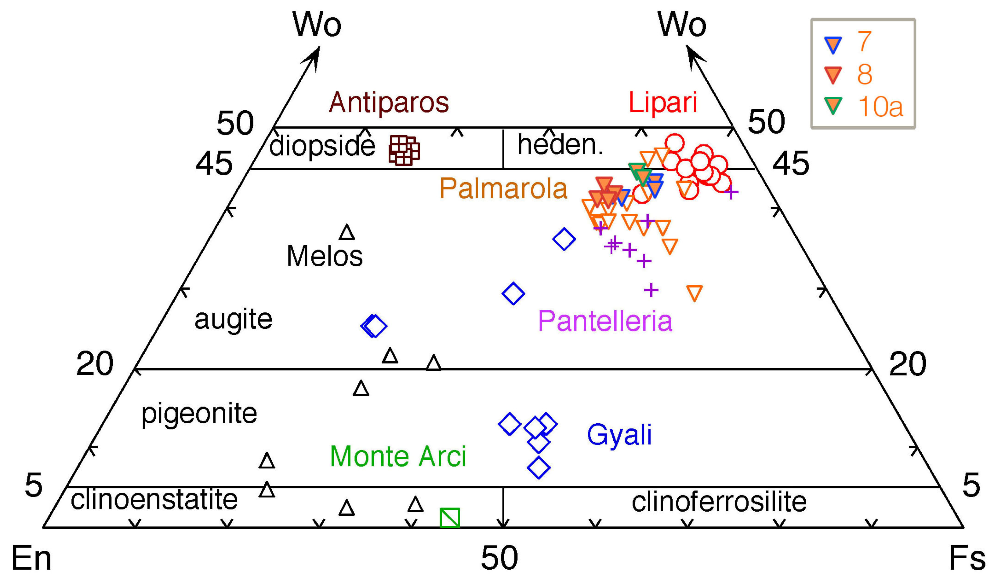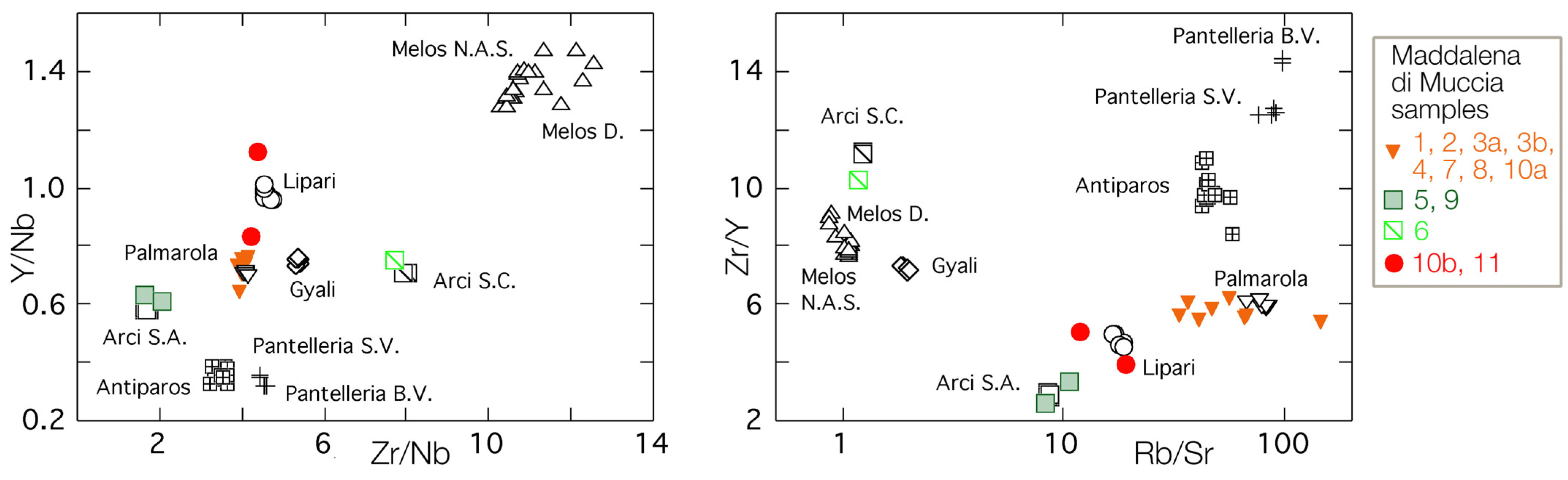 Specifically, samples 1, 2, 3a, 3b, 4, 7, 8 and 10a originate from Palmarola, samples 10b and 11 originate from Lipari, and samples 5, 9 (sub-source S.A.) and 6 (sub-source S.C.) originate from Monte Arci.
