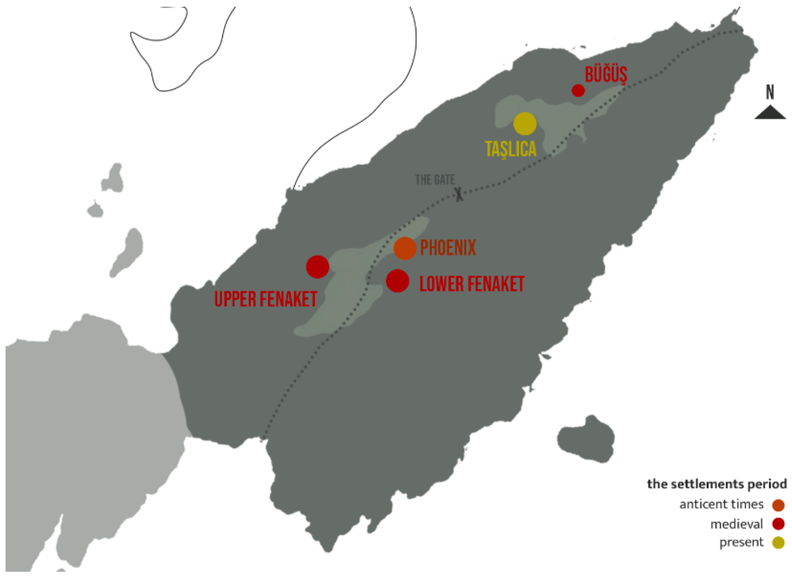 The Fenaket settlements (Lower and Upper Fenaket), located in the vicinity of the Acropolis of ancient Phoenix, exhibit a persistent vernacular order shaped by topography and water sources. The arrangement of dwellings along terraces, the proximity to cisterns and streams, and the evidence of ancient workshops and presses indicate that agriculture and animal husbandry were the principal drivers of settlement morphology since the Hellenistic period. The adaptation of necropolis terraces for habitation during the Byzantine and Medieval periods reflects a significant transformation in the cultural landscape from collective sacred use to individualised domestic occupation (