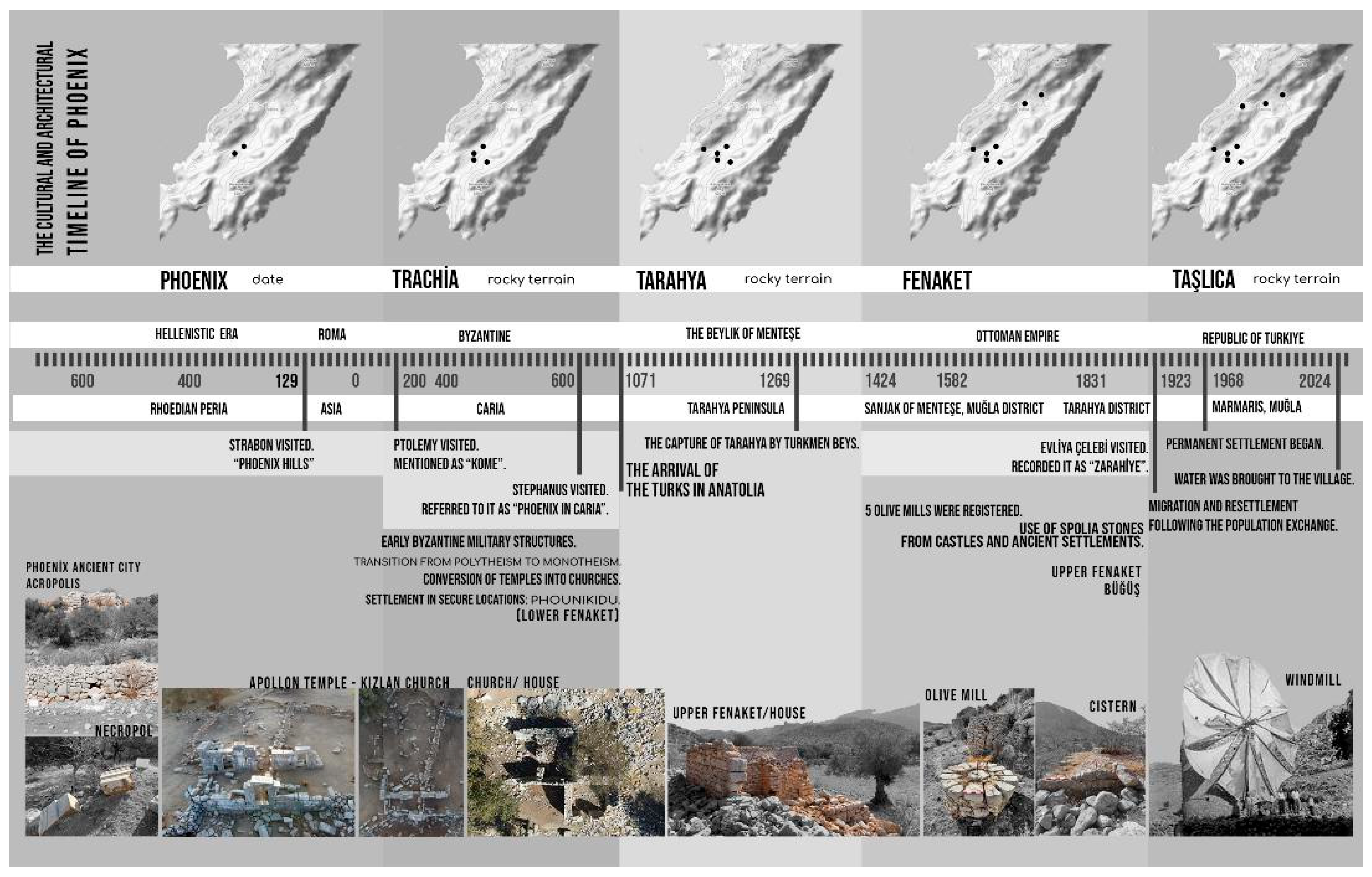 Figure 4), offers a distinctive case study of architectural and socio-economic transformation. These transformations have been shaped by successive political regimes and environmental adaptation. From the Late Classical period through the Republican era, the region underwent significant transformations in governance, marked by the transition from Rhodian hegemony to Ottoman administration and the subsequent development of modern nation-building. These historical shifts left enduring imprints on the region’s built environment and settlement patterns [