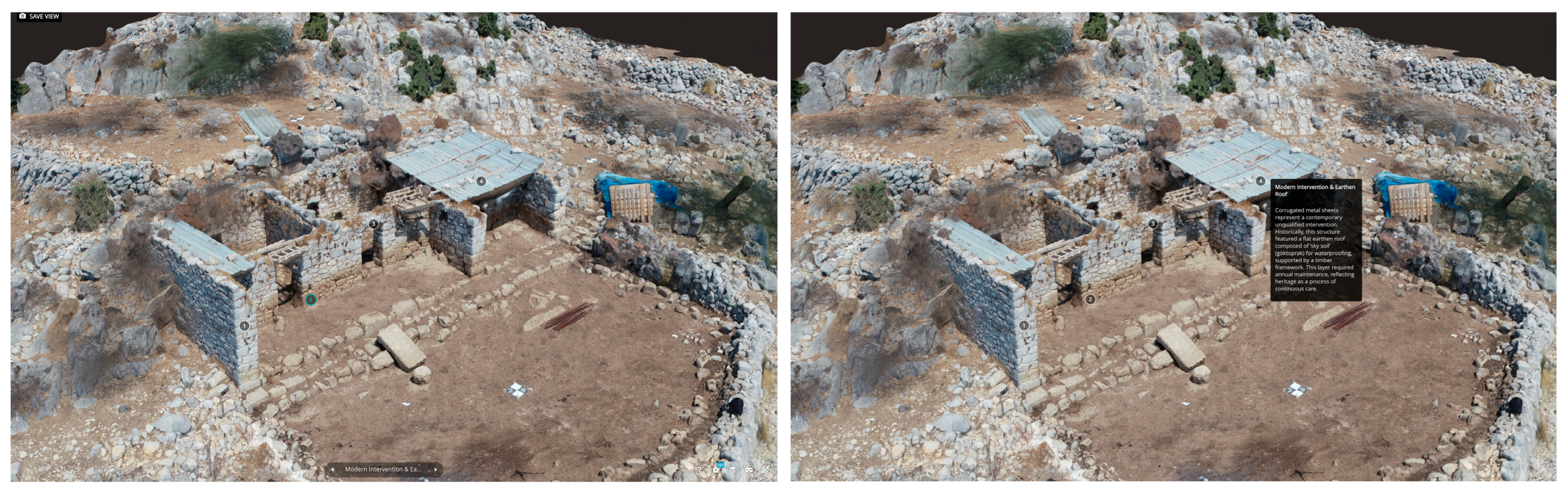 Figure 8). This model allows for a granular examination of material interventions, such as the transition from earthen roofs to modern corrugated sheets, and the integration of spolia into the masonry walls.