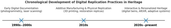 The first phase of digital heritage applications focused on documentation and conservation, where 3D imaging served primarily as a means of recording the physical characteristics of artifacts, monuments, and sites. Techniques such as laser scanning, photogrammetry, and structured-light capture allowed conservators and researchers to create accurate digital archives for study and preservation [9,10,11]. These models became essential for monitoring deterioration, planning restorations, and ensuring that valuable data would survive even if the physical object did not. In this early stage, digital replication functioned as a virtual conservation technique—an effort to secure information, not to reimagine experience. The digital object was a faithful record, valuable for its precision but detached from the emotional and educational dimensions that define public heritage encounters [12]. The development of digital replication methods in cultural heritage has followed a clear chronological trajectory, evolving from early documentation techniques to more interactive and personalized applications. This progression reflects both technological advancements and the expanding objectives of heritage professionals—from the accurate recording of form to the active mediation of meaning. The stages of this evolution are summarized in Figure 1.
