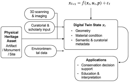 Within the heritage domain, this formulation should not be interpreted as an attempt to fully simulate physical behavior in all cases. Rather, it provides a unifying conceptual framework that explains how digital twins evolve through iterative data enrichment. New 3D scans, sensor measurements, or scholarly interpretations update the system state, allowing the digital twin to remain synchronized with the physical artifact while accommodating new knowledge. In this sense, applied mathematics functions as an enabling layer that supports continuity, validation, and adaptability, rather than as an abstract or detached analytical exercise. The conceptual structure of this applied mathematical formulation, and its role in linking physical heritage assets with their evolving digital counterparts, is illustrated schematically in Figure 3.