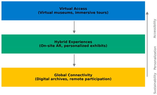 The schematic in Figure 4 presents three complementary layers of digital twin applications in cultural tourism. Virtual access refers to virtual museums and immersive digital exhibitions enabling remote exploration of heritage. Hybrid experiences integrate on-site and digital components through augmented reality, interactive displays, and personalized content. Global connectivity extends the reach of heritage institutions through digital archives and remote participation. The connection between the layers highlights a reinforcing relationship among accessibility, personalization, and sustainability, which collectively define the role of digital twins in shaping smart and inclusive heritage tourism. The arrows shown in Figure 4 do not represent a linear or procedural sequence, but rather indicate reciprocal interactions and continuous feedback among the represented dimensions, emphasizing their conceptual interdependence within participatory digital heritage processes. The directionality associated with sustainability in Figure 4 is intended to be conceptual rather than causal, illustrating reinforcement and feedback across virtual access, hybrid experiences, and global connectivity. Sustainability is therefore represented as a cross-cutting outcome that emerges from the interaction of these layers, rather than as a linear or terminal stage.