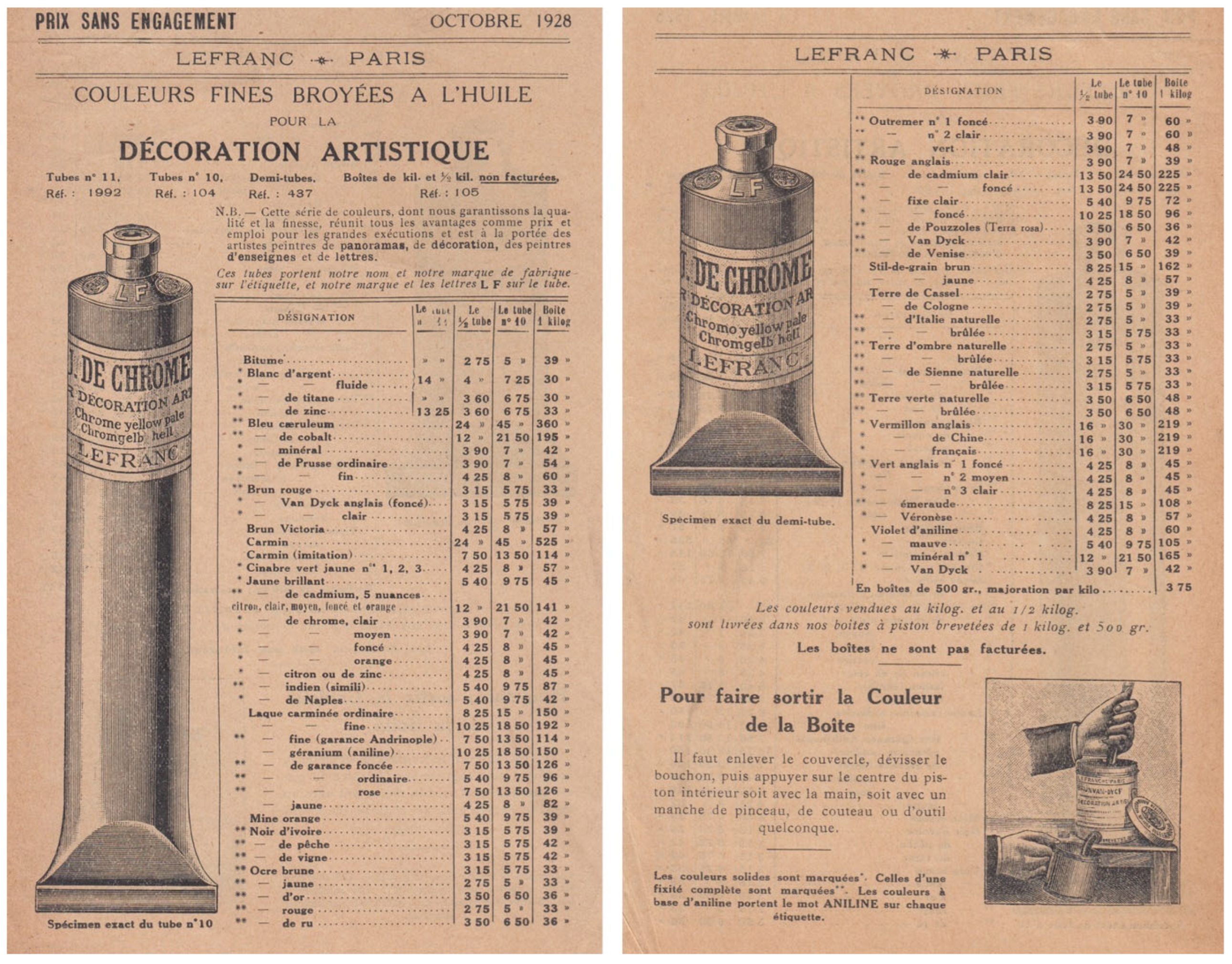 - Balcar, N.; Vila, A. Chemical composition of artistic paint: Lefranc reference samples from the first half of 20th century. In Proceedings of the From Can to Canvas. Early Uses of House Paints by Picasso and His Contemporaries in the First Half of the 20th Century, Marseille, France, 25–27 May 2011. [Google Scholar]
