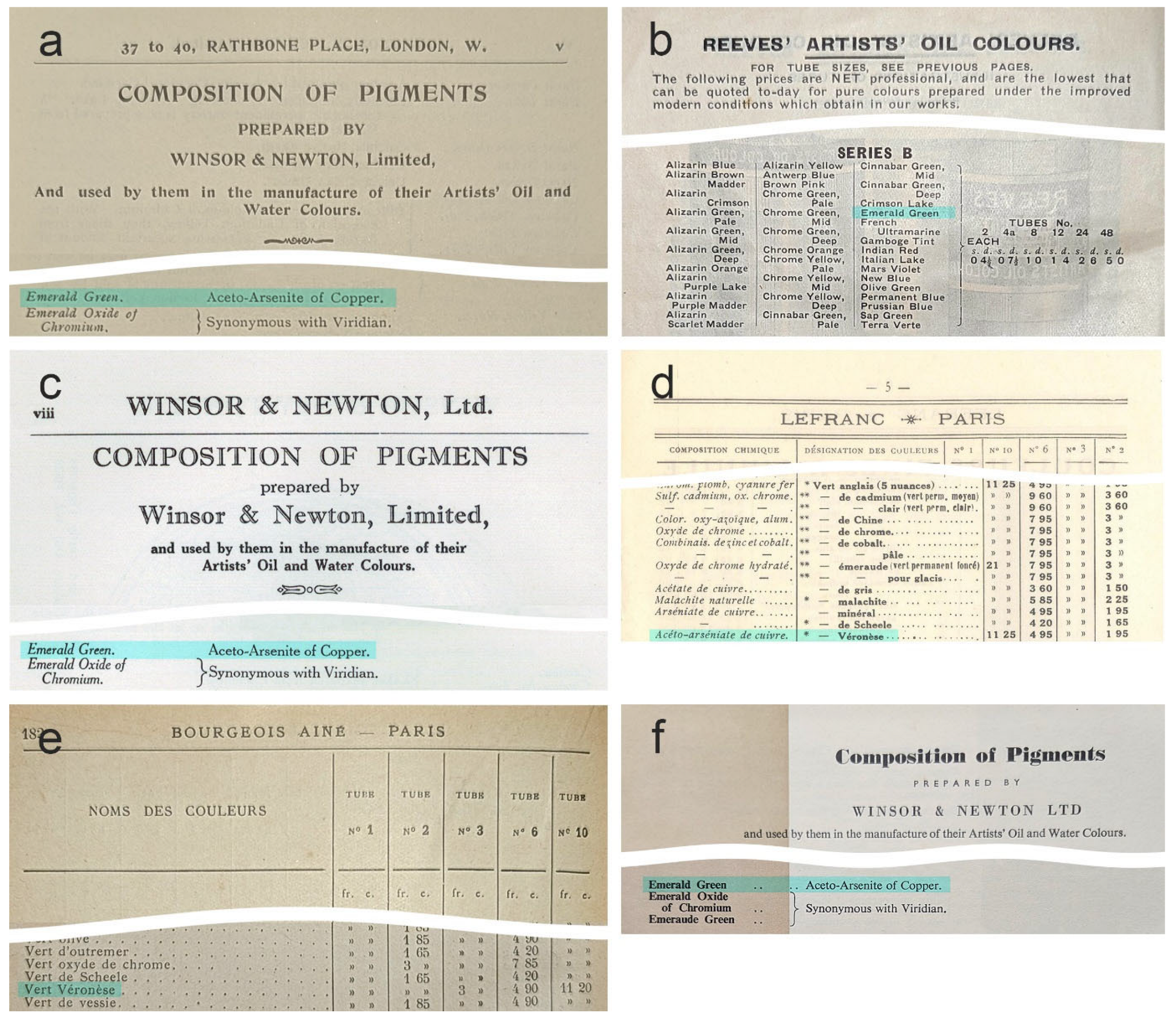 - Fiedler, I.; Bayeard, M.A. Emerald green and Sheele’s green. In Artists’ Pigments: A Handbook of Their History and Characteristics; West FitzHugh, E., Ed.; National Gallery of Art: Washington, DC, USA, 1997; Volume 3, p. 225. [Google Scholar]