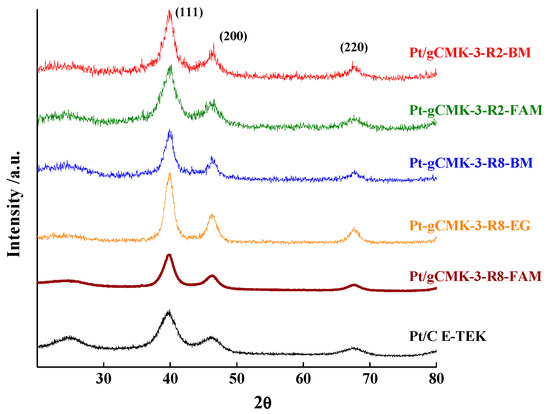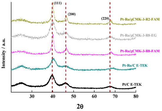 XPS analysis was carried out to identify the chemical and electronic states of the metals present in the catalysts as well as their relative surface abundance, and the results are reported in Table 2. From the deconvolution of the binding energy spectra of Pt 4f for Pt/gCMK-3 and Pt–Ru/gCMK-3 catalysts, three pairs of Pt peaks were observed, which correspond to the three oxidation states of this metal (see Figure S1 in the Supplementary Information). The transitions generated in the 4f 7/2 and 4f 5/2 orbitals of Pt (0) are described by the peaks close to 71 and 75 eV, while the second and third pair of peaks, located at 73–76 and 75–79 eV, are assigned to Pt (II) and Pt (IV), respectively. In the case of the catalysts Pt/gCMK-3, a similar surface composition of the nanoparticles was observed as all of them displayed a Pt (0) relative surface abundance around 60%. The oxidized states Pt (II) and Pt (IV) exhibited similar abundances between them (close to 20%), indicating that neither the synthesis routes nor the carbon support affect the surface composition of these catalysts. However, in the case of the Pt–Ru/gCMK-3 catalysts (spectra depicted in Figure S2 in the Supplementary Information), several differences were observed in the relative abundance of the Pt surface oxidation states, which are attributed to the entrance of Ru into the Pt lattice that induces changes in the electronic structure and interactions of this metal [25,26,27]. The catalysts supported on gCMK-3-R8 displayed a higher abundance of Pt (0), a result that matched with the trend observed for the Pt catalysts supported on gCMK-3-R8, which displayed a slightly higher abundance of the Pt (0) oxidation state compared with that observed for the Pt nanoparticles supported on gCMK-R2. Regarding the catalyst Pt–Ru/gCMK-3-R2-FAM, it is possible to conclude that, on this carbon material, the presence of Ru induced the formation of nanoparticles with a high surface content of Pt oxides.