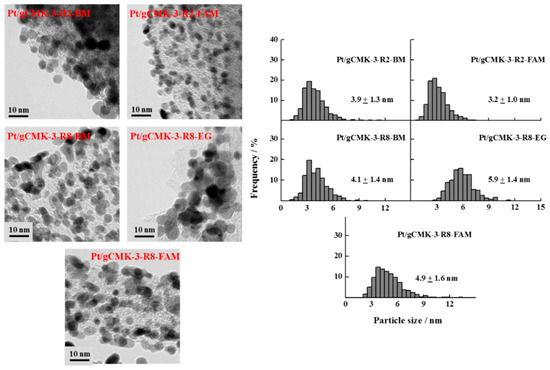 TEM images and particle size distributions of the synthesized Pt/gCMK-3 catalysts.