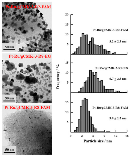 Figure 3 shows the TEM images obtained for the Pt/gCMK-3 catalysts, which demonstrate well-dispersed nanoparticles on the carbon support, although some agglomerates can be observed in some cases, such as Pt/gCMK-3-R2-BM and Pt/gCMK-3-R2-EG. Pt/gCMK-3-R2-FAM showed the smallest particle size, while Pt/gCMK-3-R8-EG exhibited the highest one, following the trend observed for the crystallite size values determined by XRD. For the Pt–Ru catalysts (Figure 4), larger particles were observed, especially for Pt–Ru/gCMK-3-R2-FAM and Pt–Ru/gCMK-3-R8-EG. These materials displayed a wide distribution of diameters between 1 and 12 nm, although the catalyst Pt–Ru/gCMK-R8-FAM showed a narrower distribution and the smallest particle size among the synthesized Pt–Ru catalysts.