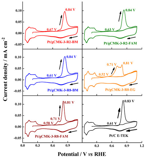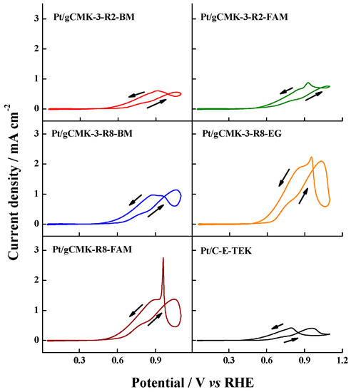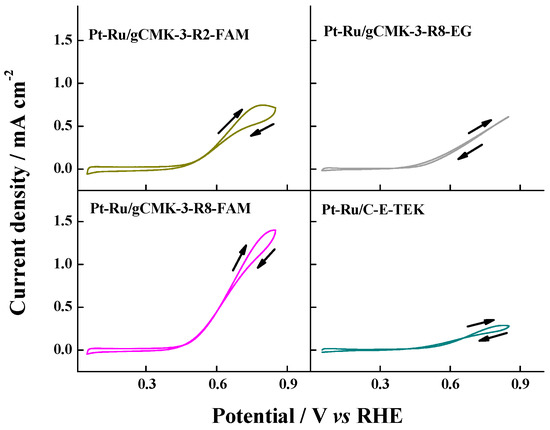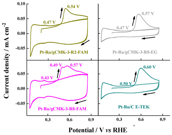 As expected, the Pt–Ru catalysts oxidized CO at lower potentials than the Pt catalysts (Figure 6) due to the presence of Ru, which helps to oxidize the CO adsorbed on Pt [21]. These values were between 0.43 and 0.47 V compared with 0.50 V detected for the commercial Pt–Ru/C from E-TEK. For the Pt–Ru samples, the main oxidation peak was attained at around 0.54–0.57 V vs. RHE, slightly lower than the commercial one (0.60 V). Only the Pt–Ru/gCMK-3-R8-FAM sample showed an additional peak at lower potential (0.49 V), which could be interpreted as enrichment of Pt and Ru oxides on the surface of the catalyst as this catalyst displayed the highest metallic Pt abundance and also a high presence of Ru oxides [21,29]. This argument is also valid for explaining the positive CO onset and peak potential values observed for the catalyst Pt–Ru/gCMK-3-R8-EG, which also exhibited the lowest Ru oxides abundance values (see Table 2).