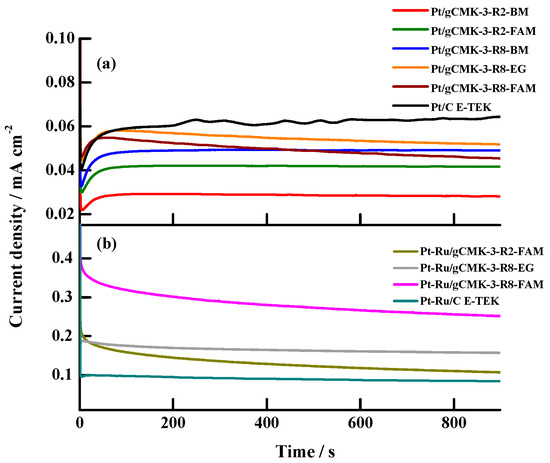 Figure 9a depicts the j–t curves for the methanol oxidation on the Pt and Pt–Ru catalysts supported on graphitized ordered mesoporous carbons recorded at 0.6 V vs. RHE, a typical DMFC work potential. In the case of the Pt catalysts, the commercial one presented the highest current densities, a fact explained by an improved reoxidation of the intermediate species formed during the methanol oxidation, which could be favored by the presence of the micropores of the carbon black, which delays their diffusion and allows their reoxidation [33]. Nevertheless, the difference in the stationary current densities among the commercial catalyst and the gCMK-3-supported catalyst with the highest performance (Pt/gCMK-3-R8-EG) was around 11–12 µA cm−2, low values that allowed us to conclude that the use of Pt/gCMK-3 catalysts could still be an alternative as anodes in DMFCs. Among the synthesized catalysts, no significant differences in the magnitude of the stationary current densities were found, except in the case of the catalyst Pt/gCMK-3-R2-BM, which displayed the lowest current density (0.0279 mA cm−2).