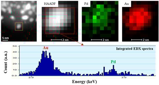 The Au, Pd specimens were characterized by transmission electron microscopy (TEM, FEI Titan 80−300, Thermo Fisher Scientific, Waltham, MA, USA). The samples were directly dispersed on copper grids covered with holey carbon film. Morphology of the catalysts was characterized by high angle annular dark-field (HAADF) scanning transmission electron microscopy (STEM), and its composition information was acquired by EDAX S-UTW EDX detector in an FEI Titan 80−300 microscope operating (Thermo Fisher Scientific, Waltham, MA, USA) at 300 kV. Analysis of STEM-EDX spectrum imaging was carried out by using TEM image and analysis (TIA 4.7 SP3 version) software. Particle size of the specimens was measured on HAADF-STEM images by using the ImageJ software (National Institutes of Health, Bethesda, MD, USA) fitting the particles with ellipsoid shapes.