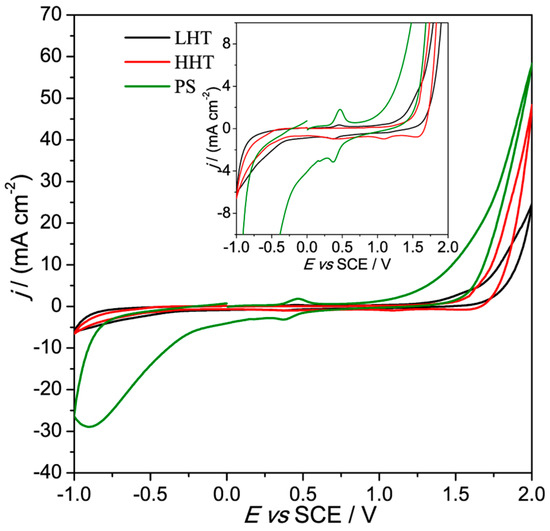 The potential window width is in the order PS < LHT < HHT (Figure 4), both in the cathodic and anodic side, pointing out the higher electrochemical stability and inertness of HHT (> LHT > PS) towards oxygen evolution reaction (OER, in the anodic side) and hydrogen evolution reaction (HER, in the cathodic side).