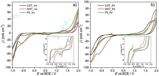 Cyclic voltammetry (CV) of PS, LHT, and HHT modified with AuNPs (a) or PdNPs (b) recorded in H2SO4 0.1 M at 100 mV s−1. In the inset, zoom on the density current values.