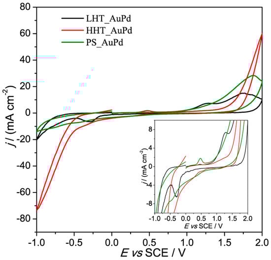 Cyclic voltammetric (CV) features of PS, LHT, and HHT modified with AuPdNPs recorded in H2SO4 0.1 M at 100 mV s−1. Zoom of the density current values in the insets.