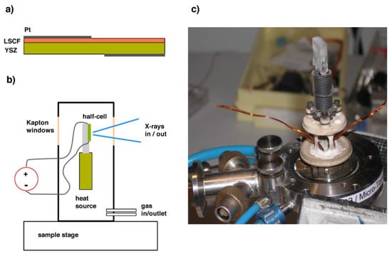 (a) LSCF/YSZ half-cell. (b) Schematic of the X-ray absorption spectroscopy setup. (c) Inner view of the cell.