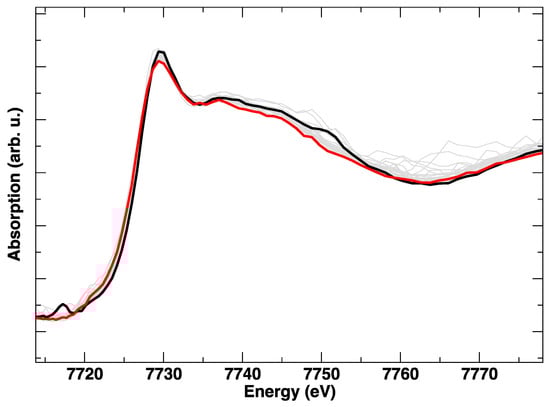 Co K-edge XANES spectra during heating, from room temperature (black line) to 800 °C (red line). Intermediate spectra are plotted in grey.