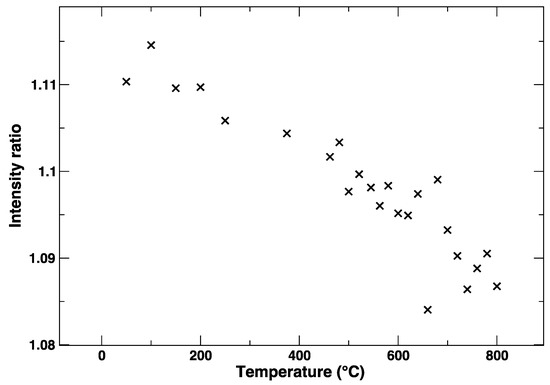 During the heating of LSCF from RT to 800 °C, the Co K-edge shows a gradual variation, which is evident from Figure 2 and Figure 3. In particular, from Figure 3, where the intensity ratio between the features at 7729 eV and 7734 eV is plotted, we get an impression how continuous the evolution of the XANES spectrum is with the temperature, without evident discontinuities due to the known rhombohedral to a cubic structural transition below 500 °C [15]. It is likely that the progressive changes in the edge are linked to the structural rearrangement, but also to the expected increase of oxygen vacancies concentration with the temperature.