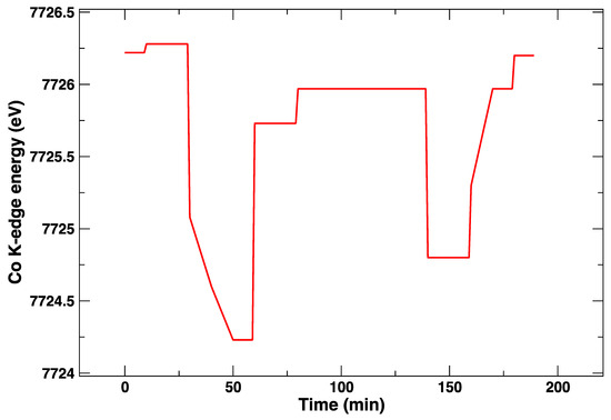 Energy of the Co K-edge, measured as the maximum of the first derivative of the XANES spectrum, as a function of time at 850 °C.