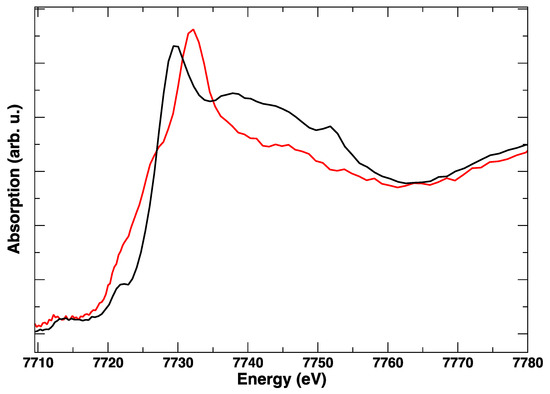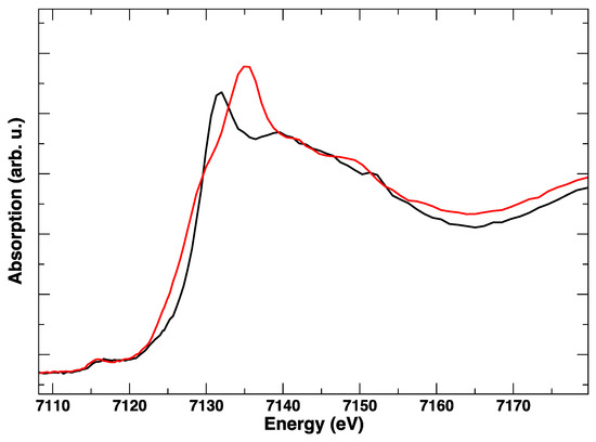 Room temperature Fe K-edge XANES spectra of LSCF before treatment (black line) and after the in situ electrical polarization experiment (red line).