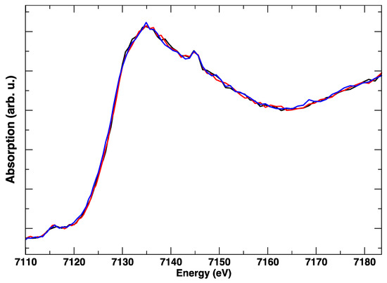 Fe K-edge XANES spectra measured at 850 °C with an applied electrical bias: +1 V (black), −1 V (red), 0 V (blue), over the course of 40 minutes.