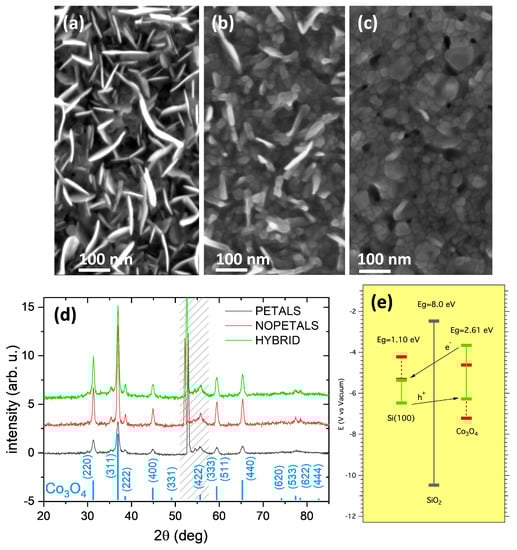 (a–c) FE-SEM top-view images of the samples PETAL (a), HYBRID (b), and NOPETAL (c). (d) Corresponding Grazing Incidence X-ray Diffraction (GIXRD) patterns. The Co3O4 reflections are marked (ICSD-63164). In the dashed region, a spurious diffraction signal from the Si substrate is visible (the X-ray penetration depth is about 80 nm). (e) Sketch of the electronic energy bands of the prepared electrodes. The theoretical positions of edges CB and VB, obtained from Pearson’s electronegativity values, are in red. The approximate positions of CB and VB edges, after the junction is formed, obtained from Mott-Schottky plots (SI. Figure S2) are indicated by green bars.