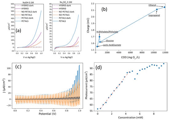 To better highlight the proportionality between the photocurrent/charge and organic content, as well as to verify the concentration range to obtain a linear response, further tests were conducted with glucose as a proof-of-concept carbon source, using the PETAL sample as an electrode. Since the current arising from the oxidation of water is lower in sodium sulfate, the current generated by the oxidation process of the organic molecule can be better highlighted. For this reason, the quantification of different concentrations of glucose was reported in a sodium sulfate solution (Figure 2d).