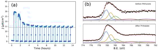 (a) Photocurrent at 0.95 V vs. Ag/AgCl of the layer PETAL over time in a 3 mM phthalate, 0.1 M sodium sulphate solution (pH = 6); (b,c) fitted X-ray photoelectron spectroscopy (XPS) spectra [] of the Co 2p3/2 orbitals taken before (b) and after (c) 14 h of phthalate oxidation.