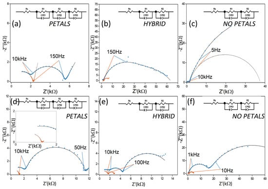 Comparison of Nyquist impedance spectra for the PETAL , NOPETAL , and HYBRID layers. (a–c) Spectra taken at 0.1 V; (d–f) spectra taken at 1 V. In all figures, spectra recorded in the dark are presented in blue, while spectra recorded under illumination are presented in orange. All spectra have been acquired in 0.1 M Na2SO4 electrolyte. Solid lines were obtained by fitting the EIS spectra with the EC (equivalent circuit) represented in the upper part of each panel. CPE indicates a constant phase element, Rs indicates the solution resistance. The inset of Figure (d) shows an enlargement of the fitting results at low impedance values.